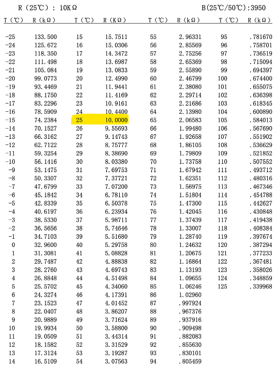 Hôm nay Việt Quân sẽ hướng dẫn cách kiểm tra cảm biến NTC 10k, các loại khác cũng tương tự chỉ khác nhau giá trị điện trở. Bên dưới là bảng tra giá trị điện trở tương ứng với dãy nhiệt độ. Cảm biến NTC 10K sẽ có giá trị Ohm tại 25oC là 10K ohm.